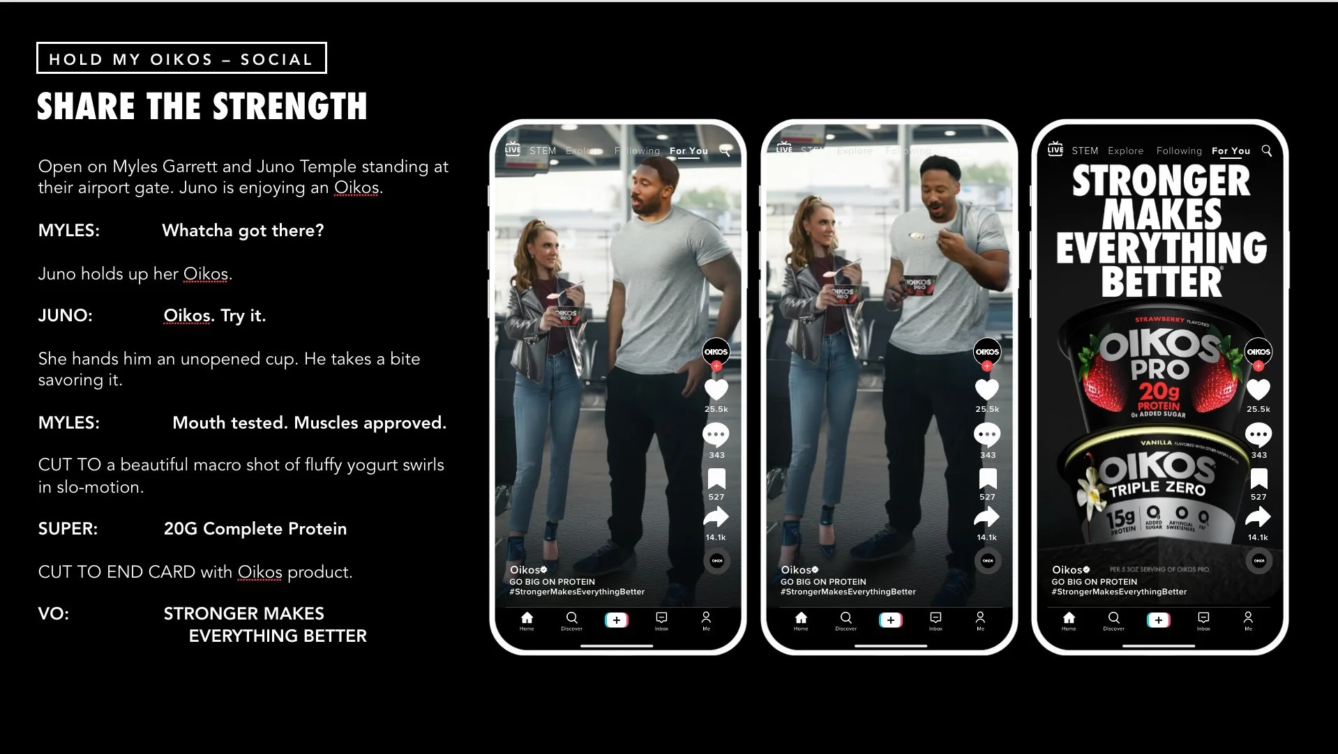 The Oikos “Surprising Strength” Super Bowl spot, starring Juno Temple and Myles Garrett, was already well underway when I was brought onto the team to help brainstorm social teaser executions. I wrote scripts for the content planned for social platforms and even had one make it all the way to set—only for the talent to refuse to read them. That’s life. Still, I’m really damn proud of the work. So here’s the script as it was presented to the client, along with the spot that aired during the big game to back it up.